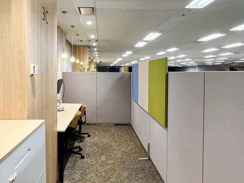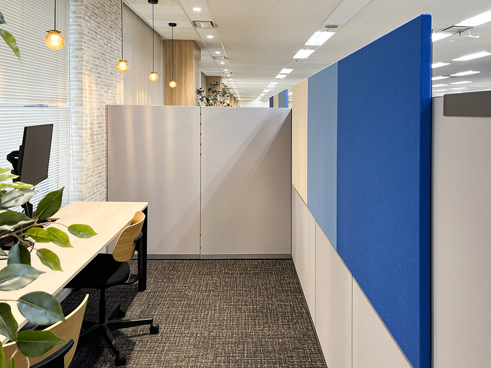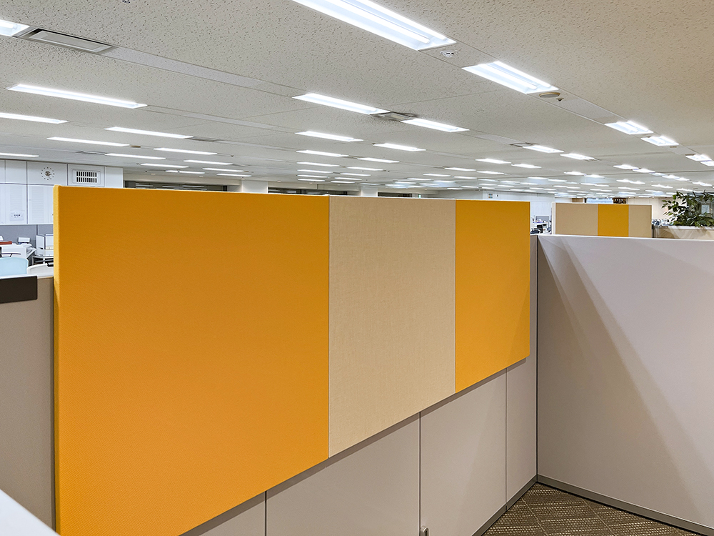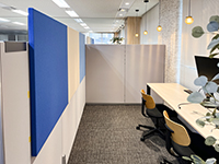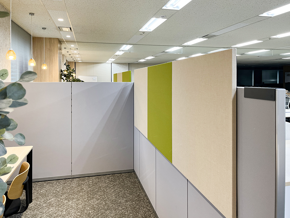 反響音軽減と目隠しのため、吸音パネルをパーティションより上に持ち出した状態での設置となりました(※マグネットを補強対応しています)。