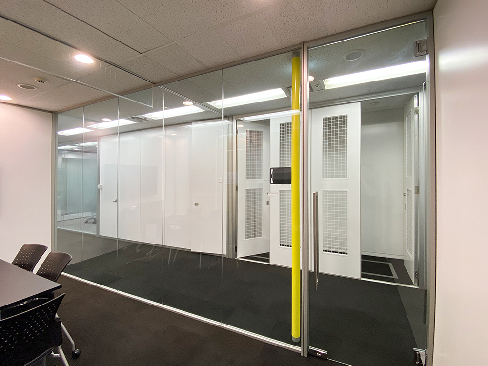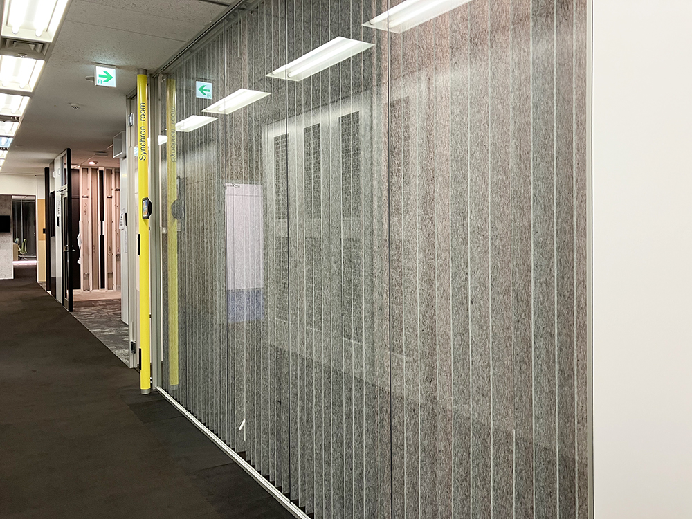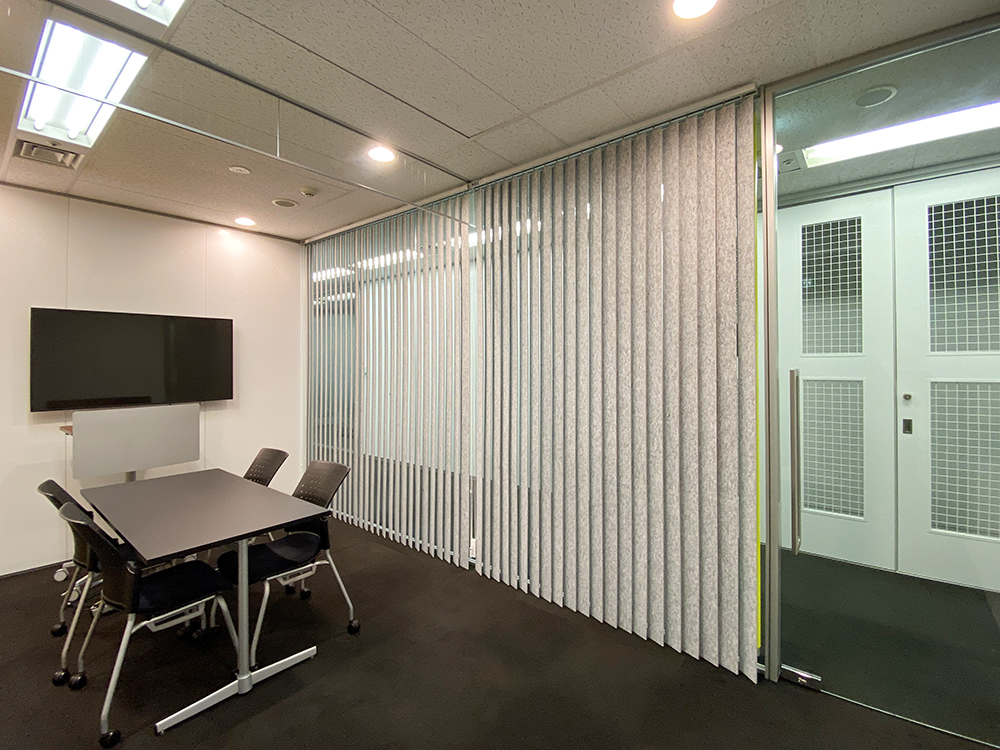 そこで吸音対策とガラス面の視線対策を実施。施工後は反響が軽減され、会議の集中度とプライバシー性が向上。外への音漏れ抑制効果も期待できる空間となりました。