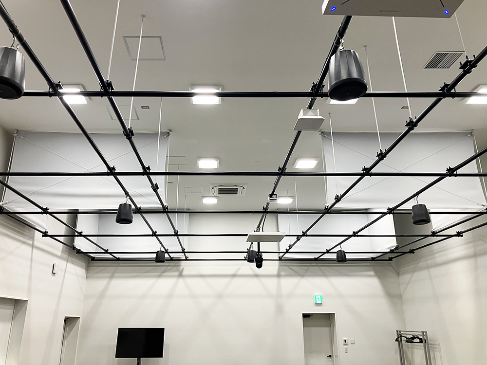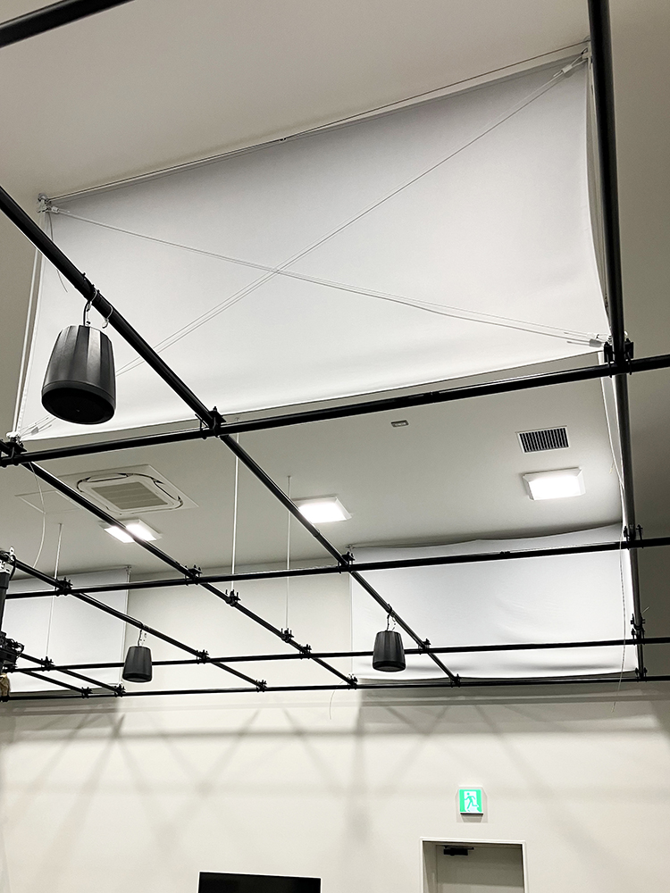 吸音カーテン生地を特殊縫製で製作。もともと天井バトンがあったため、バトンと天井の間をうまく活用できるようにヒダなしフラットの生地を天井に取り付けました。
