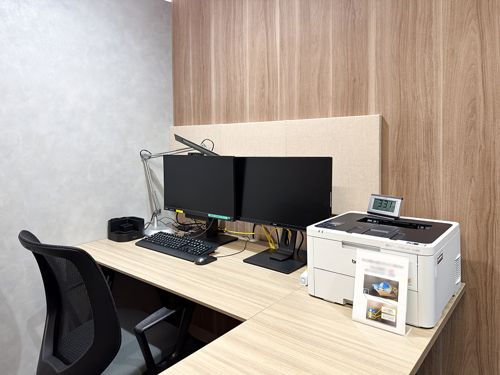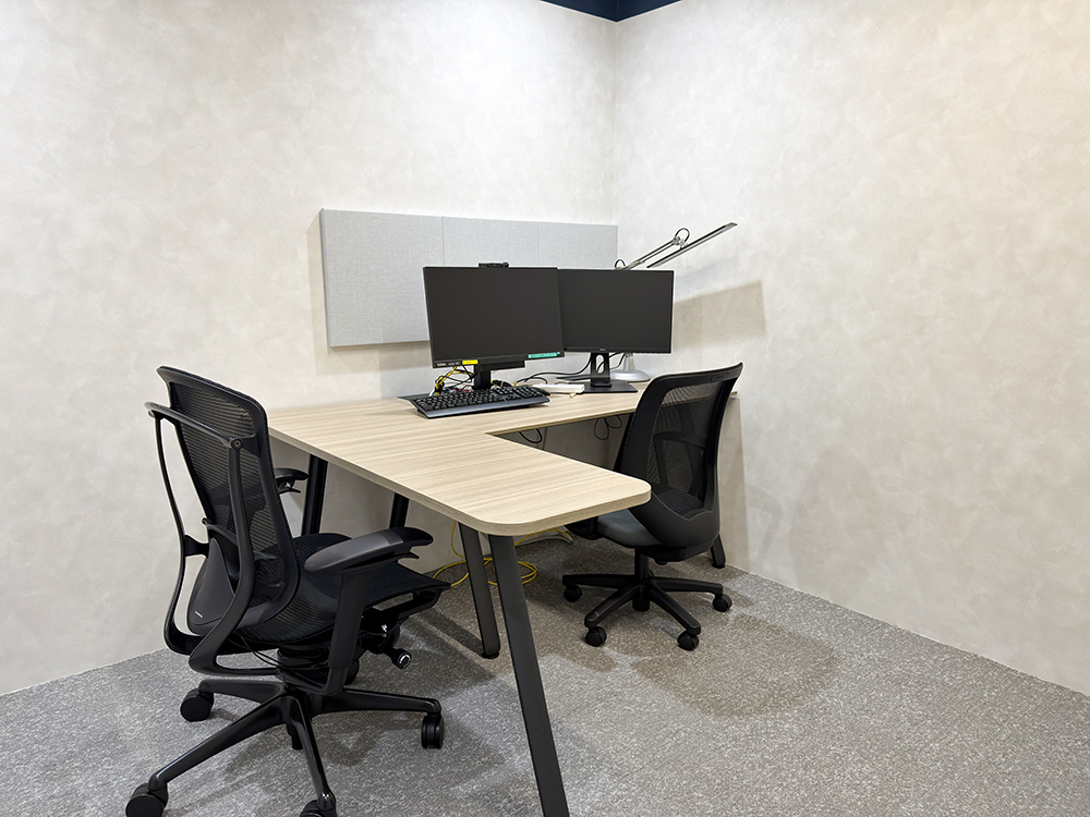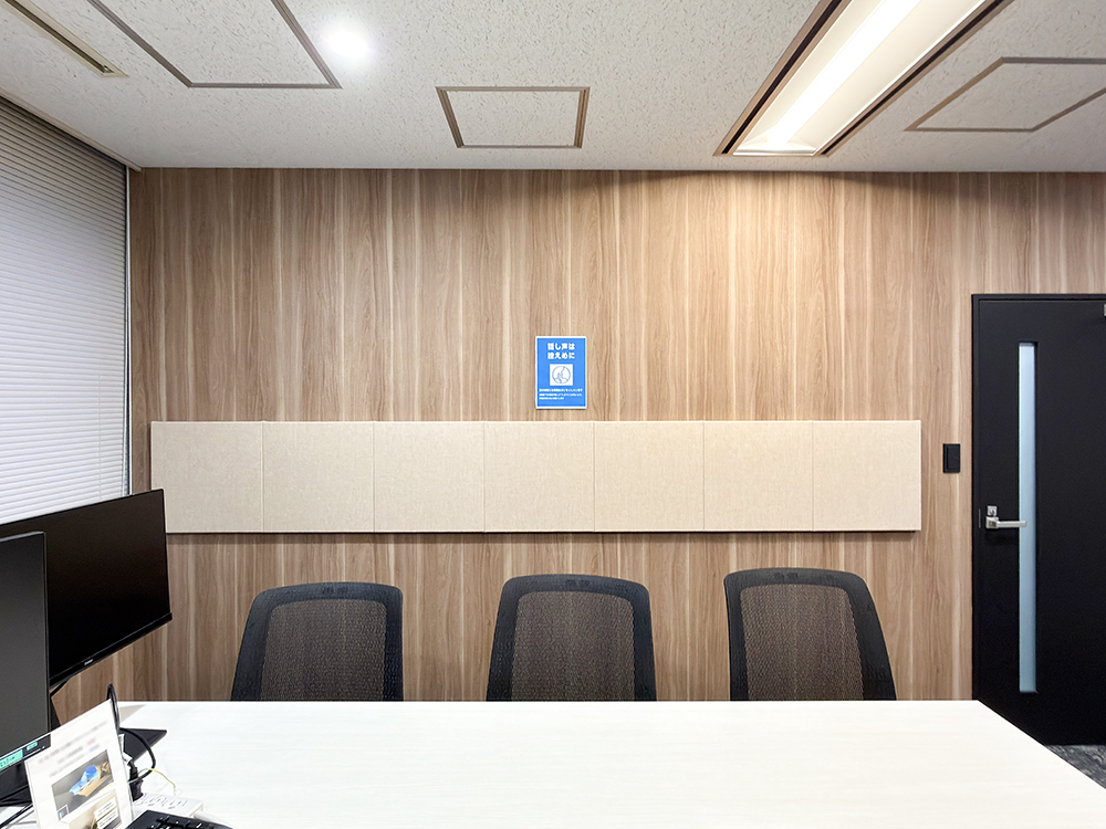 研修室に吸音パネルを設置し、反響を抑えて講師の声が明瞭に伝わる音環境を実現。内装に調和する主張を抑えた特注色を採用し、落ち着きのある研修に最適な空間へと整えました。