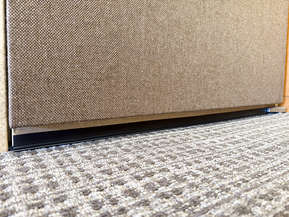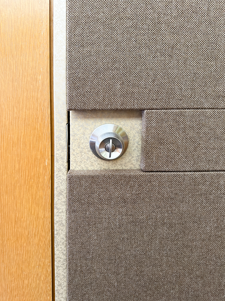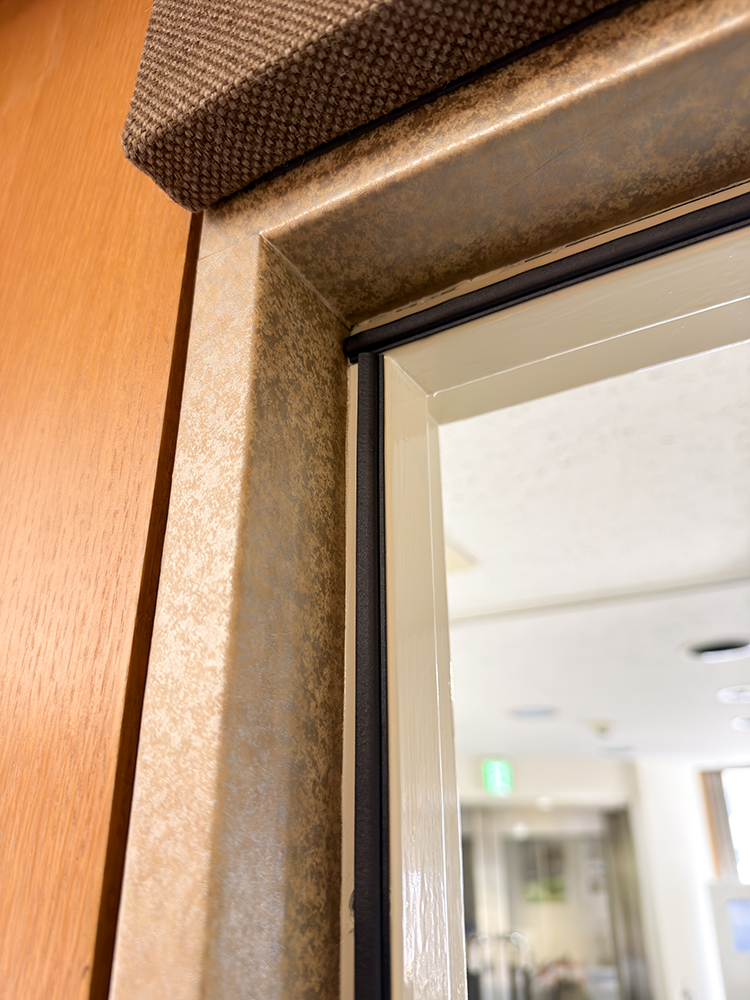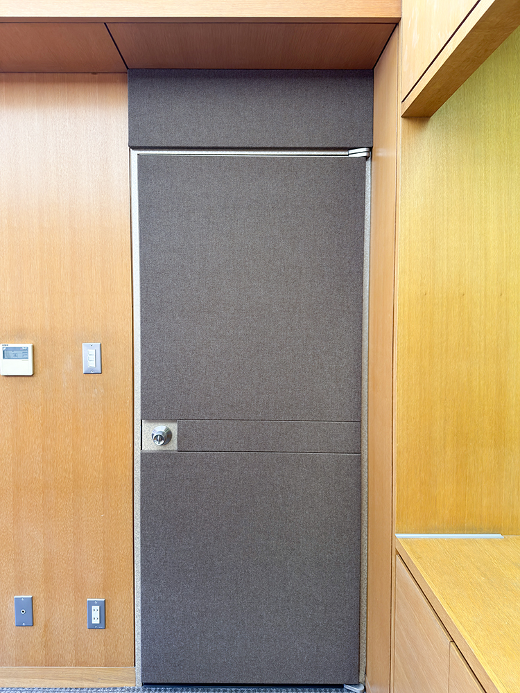 会議室ドアから待合スペースへの音漏れ対策として、ドアに吸音パネルを設置し、隙間にはオトシャット(ドアの隙間対策用部材)を取り付けました。これにより音漏れを効果的に軽減。さらに対策を強化する場合は、吸音カーテンの併用をおすすめしています。