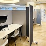 概要:オフィスの音が響きすぎ業務に支障が出ている状態でしたが、吸音3連スクリーン を設置したことによって反響音が減り集中できるようになりました。